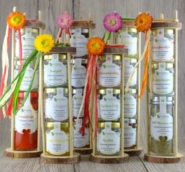 Geschenkset - HolzständerIhre Bestellung verpacken wir in einem dekorativen Holzständer, der in liebevoller Bastelarbeit aus rundum natürlichen Materialien entsteht: Holzscheiben und -stäbchen mit Bast und Trockenblumen aus dem Garten dekoriert.